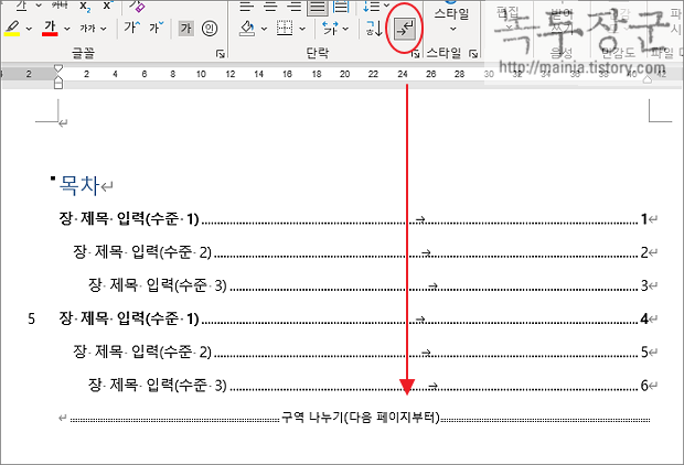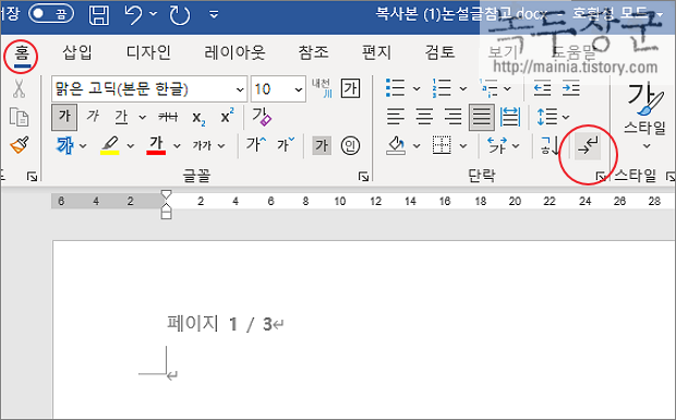▼ 다음은 구역 나누기 위치가 정확하게 어디인지 모를 때 조판 부호를 화면에 표시하기 위한 옵션을 활성화합니다. 홈 탭 > 단락 그룹 > 편집 기호 표시/숨기기 를 클릭해서 표시로 전환합니다.