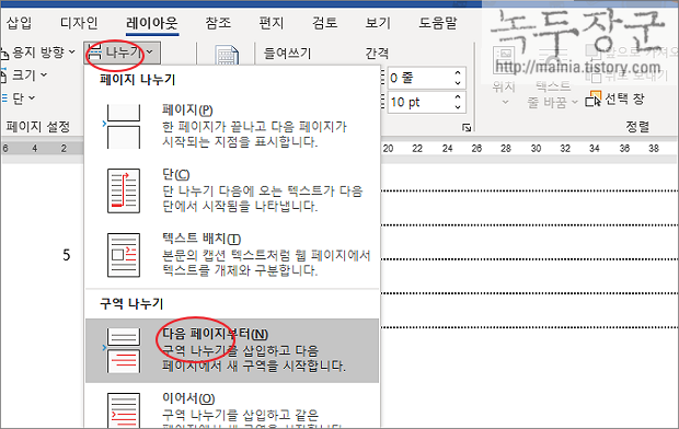 ▼ 나누기 리본 메뉴에서 구역 나누기 > 다음 페이지부터 를 선택합니다.