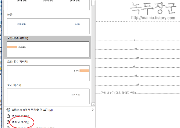 ▼ 하위 메뉴 목록에서 제일 아래로 내려가 머리글 제거를 클릭합니다.