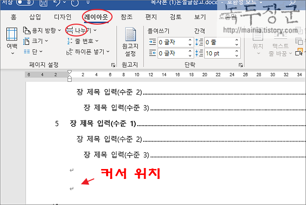 ▼ 먼저 페이지 번호를 별도로 매기기 위해서는 구역을 나누겠습니다. 레이아웃 탭 > 페이지 설정 그룹 > 나누기 리본 메뉴를 클릭합니다. 커서는 페이지 분할이 시작되는 지점에 둡니다.