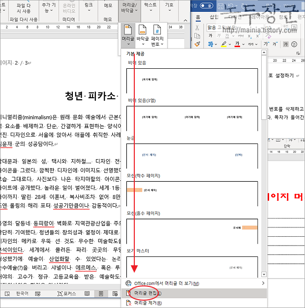 ▼ 머리글 하위 메뉴 목록에서 제일 아래에 있는 머리글 편집 메뉴를 클릭합니다.