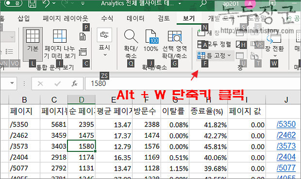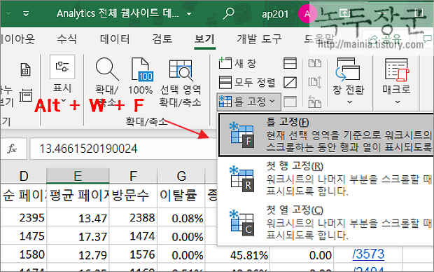 ▼ 다음은 틀 고정 > 틀 고정 단축키를 찾습니다. 틀 고정 단축키는 F 이므로 Alt + W + F 라는 키 조합이 만들어 졌습니다.