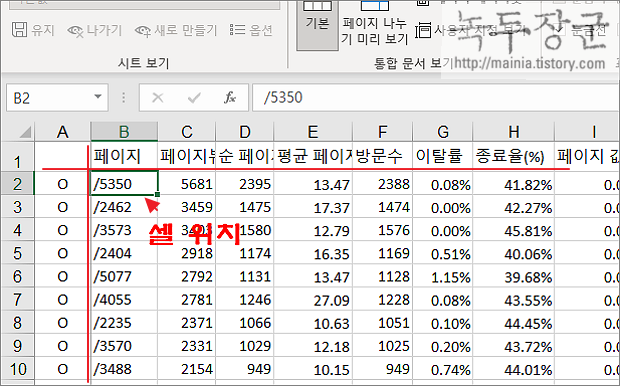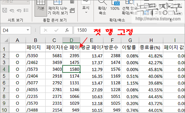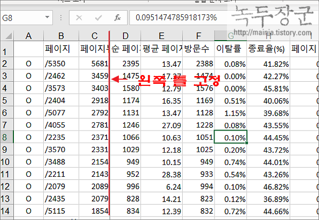 ▼ 틀 고정 라인이 첫 번째 열과 첫 번째 행에 생겼습니다.