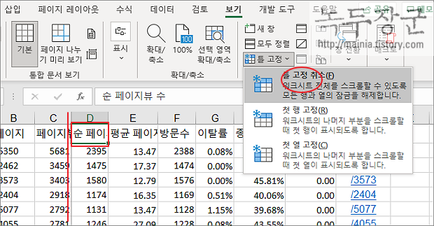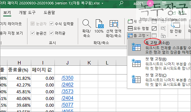 ▼ 틀 고정을 취소하는 방법은 간단합니다. 보기 탭 > 틀 고정 > 틀 고정 취소 리본 메뉴를 선택합니다. 셀 선택 위치는 어디에 있든 상관없습니다. 현재 시트에 틀 고정이 적용되어 있다면 틀 고정 이 틀 고정 취소로 바뀝니다.
