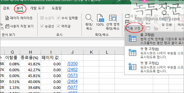 ▼ 왼쪽과 상단에 틀을 고정하는 "틀 고정" 메뉴 외에 "첫 행 고정" 과 "첫 열 고정" 이 있습니다. 메뉴를 클릭하면 첫 행과 첫 열을 고정합니다.