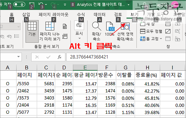 ▼ 리본 메뉴 단축키를 이용합니다. Alt 를 누르면 리본 메뉴 탭 단축키가 화면에 나타납니다. 틀 고정은 보기 탭에 있으므로 Alt + W 를 눌러 이동합니다.