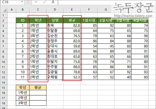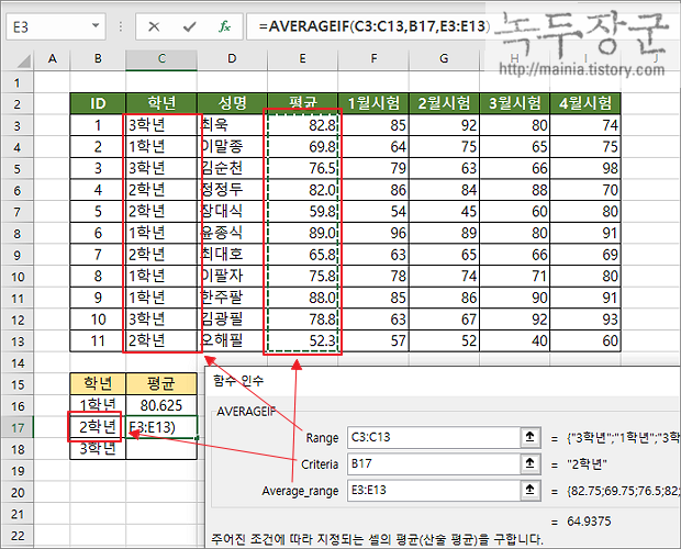 ▼ Ranage 는 조건 검색 영역인 "학년" 범위를 입력합니다. 두 번째 Criteria 는 "학년" 열에서 검색할 조건값이 들어가 있는 셀을 지정합니다. Average_range 는 평균을 구할 영역을 지정합니다.