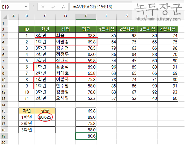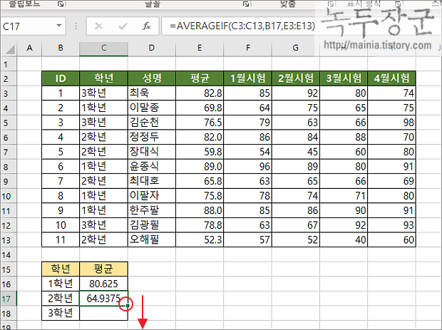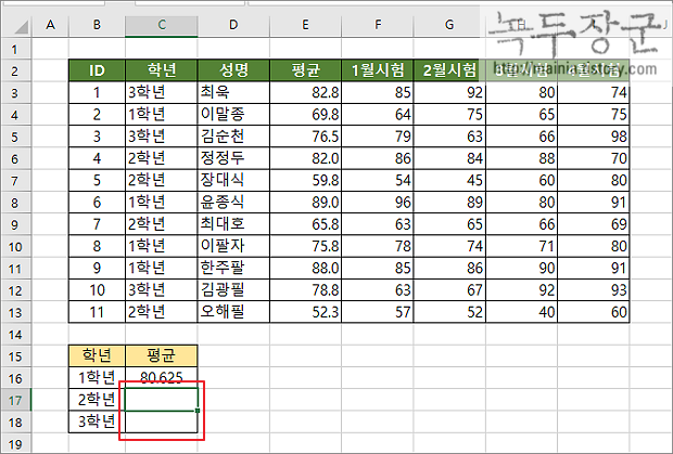 ▼ 함수를 실행한 결과는 다음과 같습니다. "학년" 열에서 "2학년" 에 해당하는 행을 찾아 "평균" 값을 구했습니다. 바로 아래에 있는 "3학년" 의 평균값을 구하기 위해 마우스로 점을 드래그해서 자동 채우기를 실행합니다.