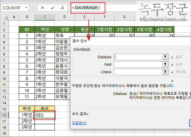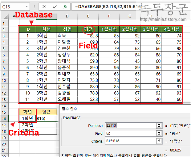 ▼ 함수에서 입력해야 할 인수는 총 3가지입니다. Database 에 해당하는 영역은 제목을 포함한 표 전체입니다. 왜냐하면 조건으로 입력하는 Criteria 에 제목을 검색할 값도 지정하기 때문입니다. Field 는 평균을 구할 영역의 시작 지점이 들어갑니다. 마지막 Criteria 는 검색할 조건 영역을 지정합니다. 제목인 "학년" 도 포함해야 합니다.