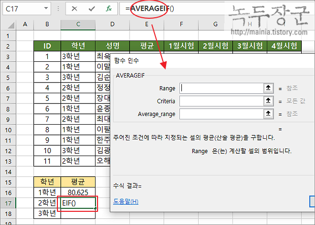 ▼ 2학년 평균 값을 출력할 셀을 선택하고 수식 입력기에서 AVERAGEIF 함수를 작성을 위한 창을 띄웁니다.