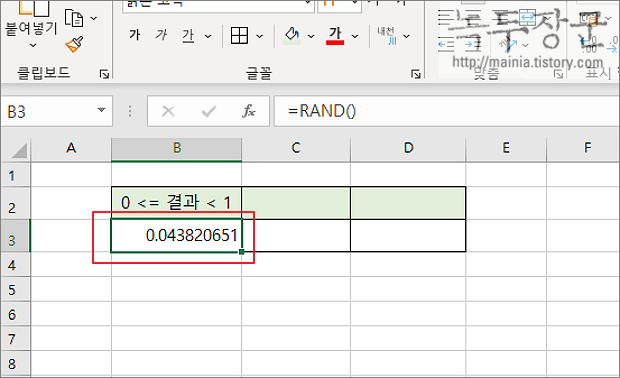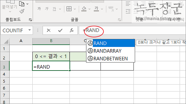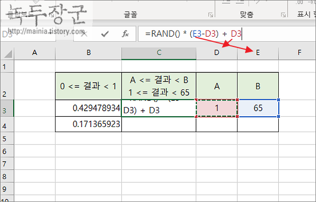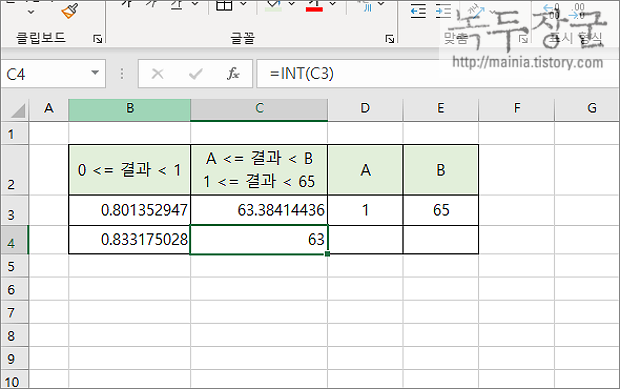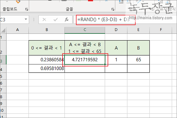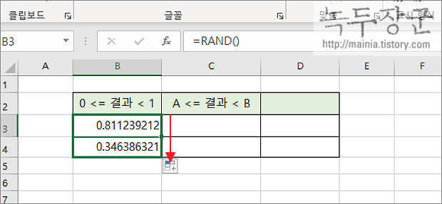 ▼ 수식을 완성하고 A 와 B 에 사이의 난수값은 추출한 결과는 다음과 같습니다.