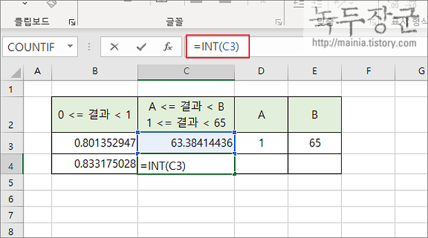 ▼ 1과 65 사이값에서 소수점을 제외하기 위해 적용한 INT() 함수의 결과는 다음과 같습니다.