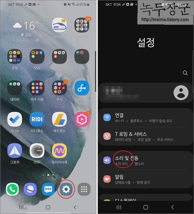 ▼ 진동세기 조절을 위해 설정 페이지로 이동합니다. 설정 목록에서 소리 및 진동 메뉴를 찾아 클릭합니다.