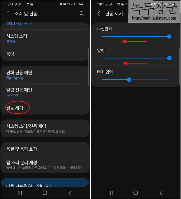 스마트폰 기본 진동세기가 너무 강해서 깜짝 놀랐던 적이 있습니다. 갤럭시에는 진동 세기를 조절할 수 있는 옵션을 제공합니다. 전화 수신, 알림, 키보드 터치 입력의 진동세기를 나누어서 설정할 수 있습니다.