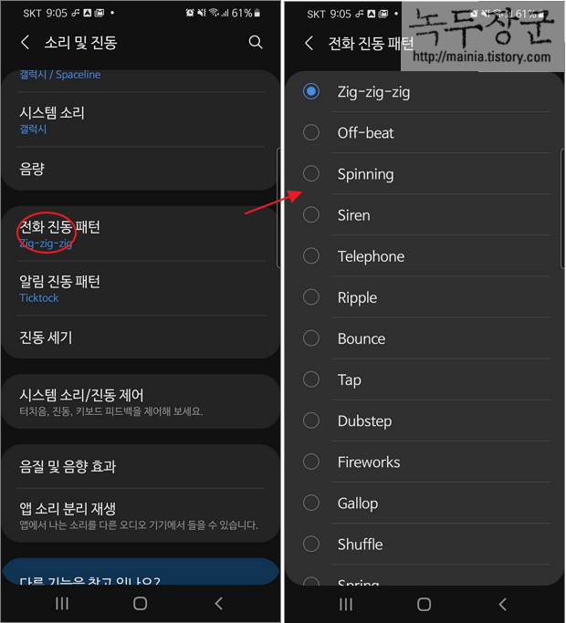 ▼ 다음은 진동 패턴을 바꿔보겠습니다. 이전 화면으로 이동해서 전화 진동 패턴 메뉴를 클릭합니다. 기본으로 설정된 Zig-zig-zig 외에 목록에서 마음에 드는 진동을 선택합니다.