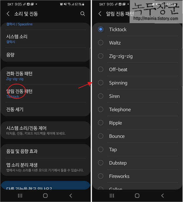 ▼ 전화 진동 아래에 알림 진동 패턴도 변경이 가능합니다. 목록에서 마음에 드는 진동을 선택해서 변경합니다.