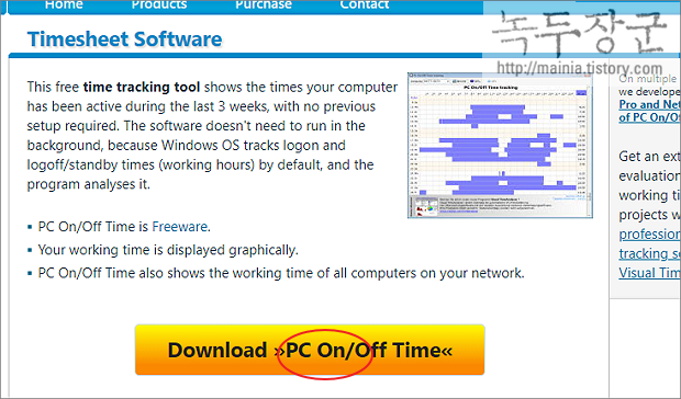 ▼ 윈도우 로그 기록을 볼 필요없이 무료 유틸리티를 설치하면 시간 날짜 별로 얼마나 컴퓨터를 사용했는지 확인해 볼 수 있습니다. 사이트 주소는 아래와 같습니다. 홈페이지의 Download PC On/Off Time 버튼을 클릭해서 다운받습니다.