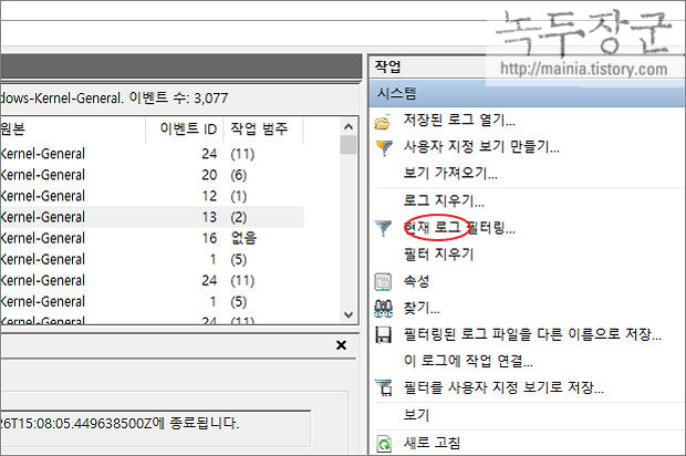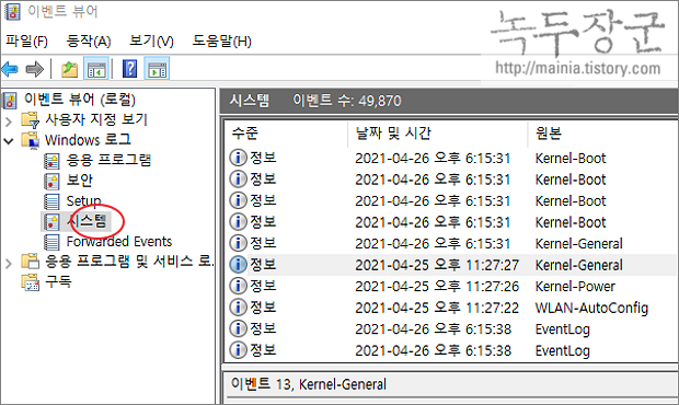 ▼ Windows 로그 하위에 시스템 항목으로 이동합니다. 이곳에서 로그를 통해 컴퓨터를 끄고 켠 흔적을 찾아보겠습니다.