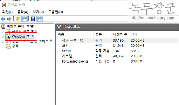 ▼ 화면에 나타난 이벤트 뷰어 창에서 왼쪽 사이드 목록으로 갑니다. Windows 로그 메뉴를 찾아 선택합니다.