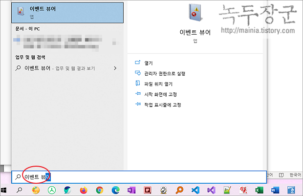 ▼ 윈도우의 모든 로그는 "이벤트 뷰어" 유틸리티에서 볼 수 있습니다. 검색창에서 이벤트 뷰어를 찾아 실행합니다.