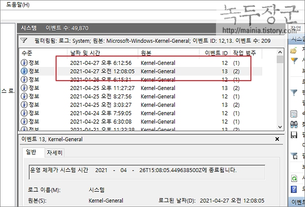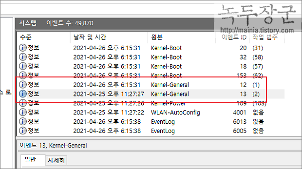 ▼ 목록을 내려가면 시간차가 나는 곳이 있습니다. 이벤트명은 Kernel-General 입니다. 이벤트 ID 가 13 은 컴퓨터가 꺼질 때 저장한 로그입니다. 다시 컴퓨터를 시작하는 순간 Kernel-General 가 12 가 찍힙니다. 이것으로 컴퓨터 사용과 종류를 알 수 있겠죠.