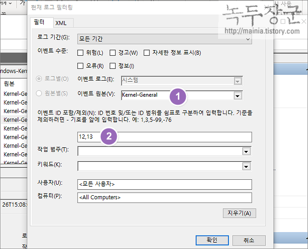 ▼ 현재 로그 필터링 설정 창이 나타나면 이벤트 원본에서 "Kernel-General" 을 찾아 체크합니다. 다음 이벤트 ID 에 컴퓨터 종료와 시작을 알리는 12, 13 값을 콤마로 구분해서 입력합니다. 팝업 화면 아래로 내려가서 확인 버튼을 눌러 필터링을 시작합니다.