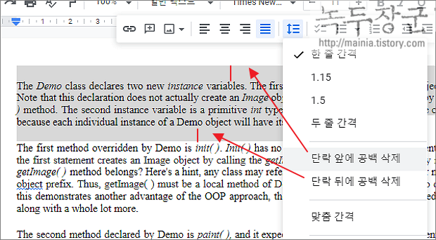 ▼ 다음은 단락 간의 간격을 조절하는 방법입니다. 단락 간 간격 조절 옵션도 줄 간격 메뉴 목록에 위치하고 있습니다. 현재 단락 간 간격이 적용되어 있는 위치라면 "단락 앞에 공백 삭제/단락 뒤에 공백 삭제" 메뉴가 나타날 겁니다. 메뉴를 선택해서 앞/뒤 단락의 간격을 없애 보겠습니다.
