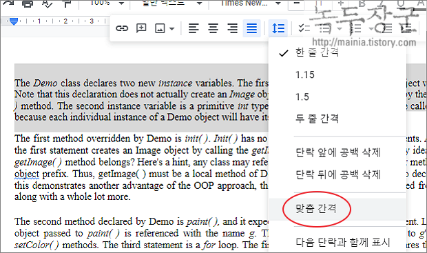 ▼ 다시 줄 간격 버튼을 클릭해 보세요. 이전과 달리 "단락 뒤에 공백 추가" 버튼을 볼 수 있습니다. 이렇게 단락 간 공백이 없는 곳에는 메뉴를 통해 기본 간격을 추가할 수 있습니다.