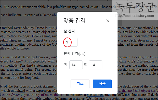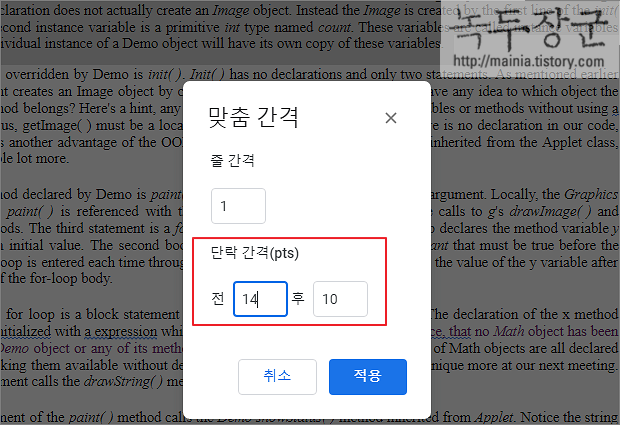▼ 맞춤 간격 입력란에서 원하는 줄 간격 값을 입력하고 적용 버튼을 클릭합니다. 바로 아래 앞/뒤 단락간 간격도 조절이 가능합니다.