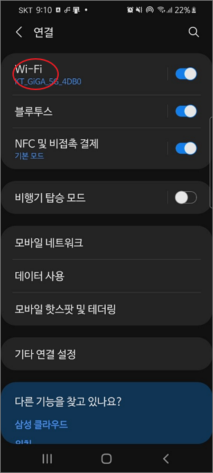 ▼ 두 가지 인터넷 연결 방법 중 데이터 연결에서 와이파이로 바꾸기 위해 설정 > 연결 화면으로 이동합니다.