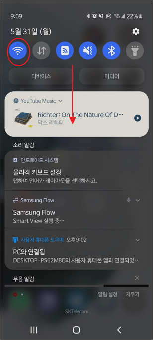 ▼ 다음은 빠른 실행 아이콘 목록에서 빠르게 와이파이를 연결해 보겠습니다. 화면 상단을 손가락으로 누른 상태에서 아래로 내립니다. 다시 화면 상단으로 가서 와이파이 아이콘을 꾹 누릅니다.