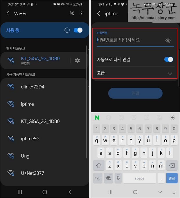 ▼ Wi-Fi 목록에서 연결하고 싶은 네트워크를 클릭합니다. 다음 화면에서 비밀번호를 입력하고 연결을 시도합니다. 정상적으로 연결이 되었다면 현재 네트워크 목록에 연결됨 이라고 표시가 됩니다.