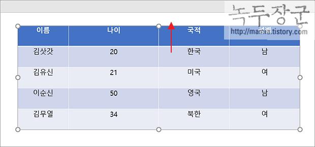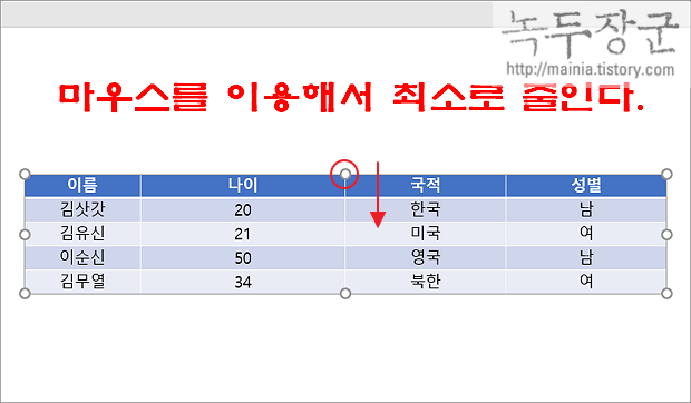 ▼ 마지막으로 마우스를 이용해서 조절하는 방법입니다. 표를 선택하고 상단라인 중앙이나 하단에 조절점을 마우스로 눌러 최대한 줄입니다.
