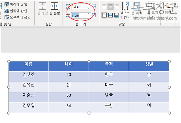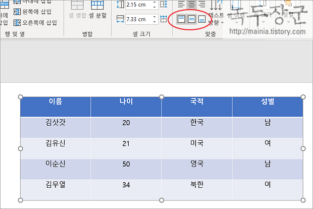▼ 열과 행의 크기를 일정하게 맞췄습니다. 텍스트가 글의 상단에 올라가 있다면 가운데 맞춤 기능을 이용해서 정렬합니다.