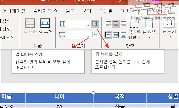 | ◎ 행, 열 일정하게 조절하는 메뉴 이용하기 |