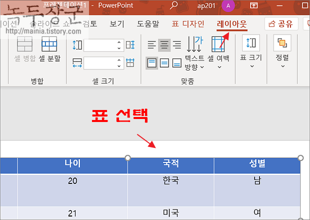 ▼ 먼저 표를 선택합니다. 다음은 상단에 나타난 레이아웃 탭으로 이동합니다.