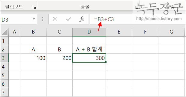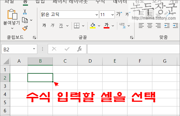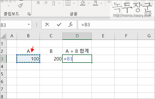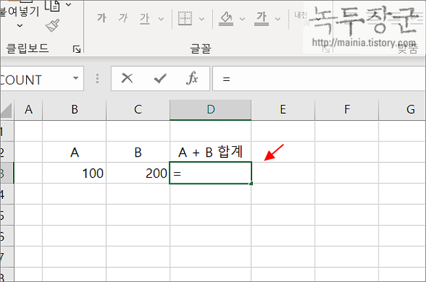 ▼ 다음은 다른 셀을 참조해서 수식을 만드는 방법입니다. 첫 번째 단계는 계산 결과를 출력할 셀을 선택하고 등호(=) 입력합니다.
