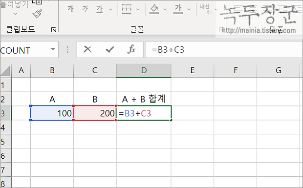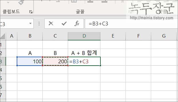 ▼ 다음 더하기 연산을 위해 “+” 입력하고 셀을 선택하거나 주소를 입력한 후 Enter 를 눌러 결과를 출력합니다. 수식에서 셀 주소로 쓰인 텍스트의 색상은 참조한 셀의 테두리 색상과 동일합니다. 색상 비교는 어느 셀을 참조해서 수식이 만들었는지 찾을 때 유용합니다.