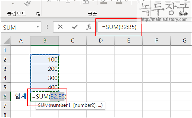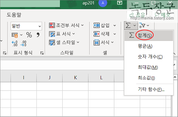 ▼ 메뉴 아래에는 많이 사용하는 5 종류의 함수를 제공합니다. 제일 상단에 합계를 선택해 보세요.