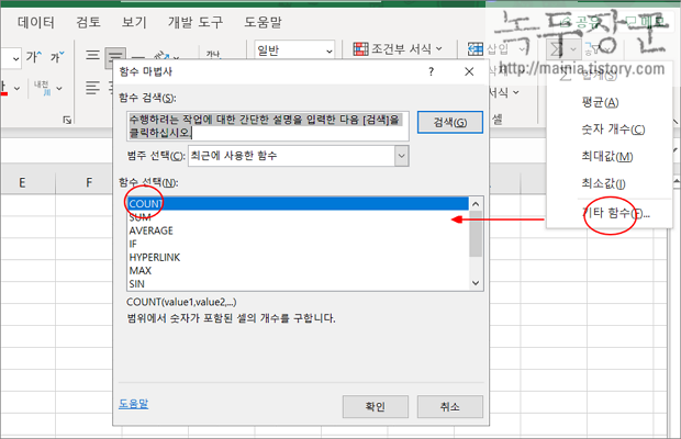 ▼ 자동 합계 리본 메뉴 목록에 없는 함수는 기타 함수 를 통해서 추가할 수 있습니다. 원하는 함수를 골라서 선택합니다.