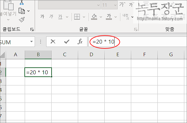 ▼ 먼저 사칙연산 수식을 만들어 보겠습니다. 사칙연산에 쓰이는 특수문자는 더하기(+), 빼기(-), 곱하기(*), 나누기(/) 입니다. 수식입력기에서 제일 앞에 반드시 등호(=) 를 붙여야 합니다. 수식 만드는 절차는 다음과 같습니다. 먼저 수식이 들어갈 셀을 선택합니다.