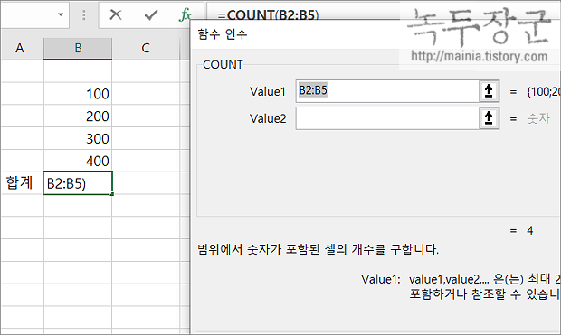 ▼ 함수의 매개변수 입력창이 뜨면 셀 주소나 값을 입력하고 창을 닫습니다.