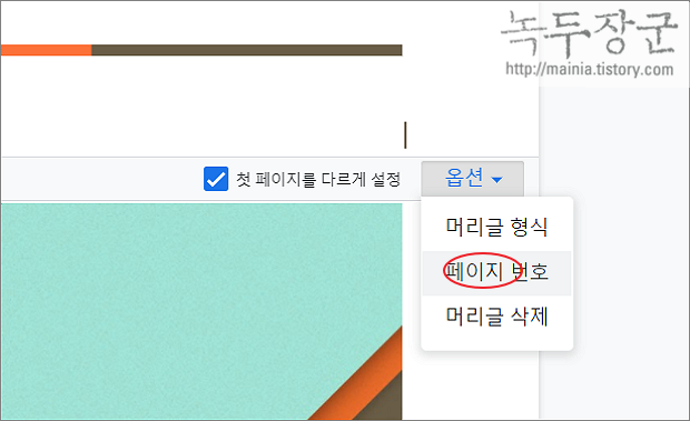 ▼ 머리글 입력란 오른쪽 하단에 옵션 > 페이지 번호 메뉴를 선택합니다.