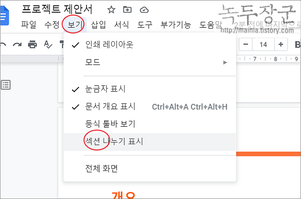 ▼ 섹션 나누기 표시 를 선택하면 화면에 점선 모양의 줄이 나타납니다. 이것이 섹션 나누기 기호입니다.