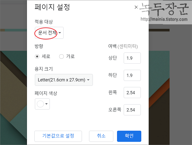 ▼ 페이지 설정 화면에서 여백 지정이 가능합니다. 페이지 설정에는 문서 여백의 적용 대상이 “문서 전체” 로 되어 있습니다. 현재 문서에는 섹션 나누기가 되어 있지 않기 때문에 적용 대상에서 "문서 전체" 만 선택할 수 있습니다.