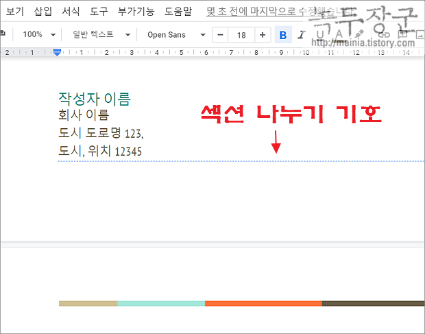▼ 섹션 나누기를 통해 별도의 여백을 설정해 보겠습니다. 우선 섹션을 나눕니다. 섹션을 나누기 위한 위치에 커서를 둡니다.