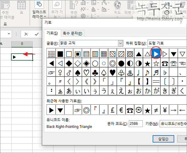▼ 사용자가 원하는 특수문자를 찾아 셀에 추가합니다.