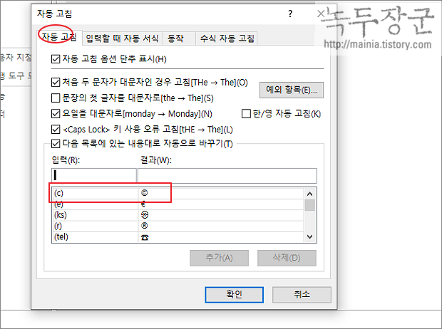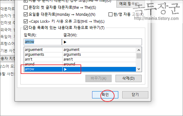 ▼ 자동 고침 창에서 자동 고침 탭으로 이동한 뒤 아래로 내려갑니다. "다음 목록에 있는 내용대로 자동으로 바꾸기" 항목의 리스트에 추가된 것들이 단축키에 연결된 특수문자 들입니다. 이곳에 없는 것들은 사용자가 추가할 수 있습니다.