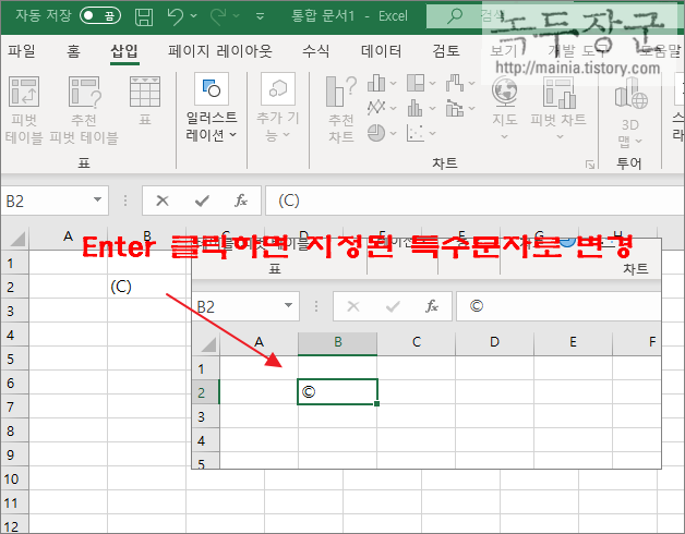 ▼ 먼저 단축키를 이용해서 특수 문자를 입력하는 방법을 알아보겠습니다. 사실 "단축키" 보다는 "단축 문자", "변환 문자" 가 더 정확할 수 있습니다. 그림처럼 셀에 "(C)" 문자를 입력하고 Enter 를 눌러 보세요. 화면에는 이전에 입력한 문자대신 해당하는 특수문자가 나타납니다.