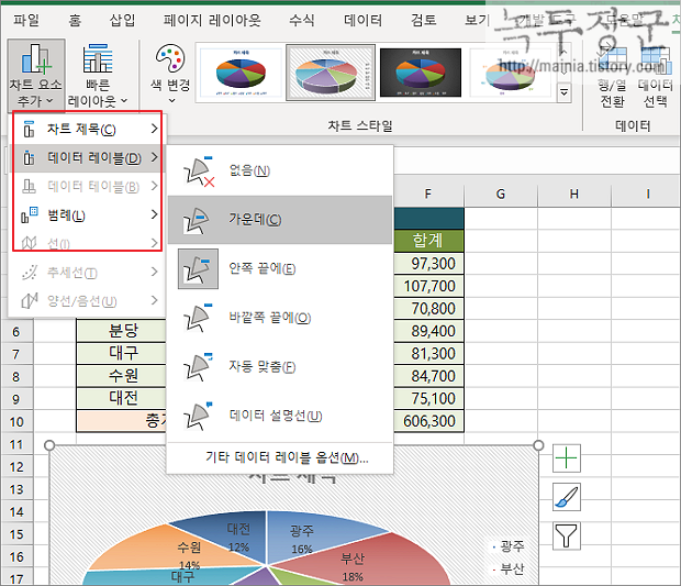 ▼ 차트에 특정 요소가 빠져 있다면 차트 디자인 탭 > 차트 요소 추가 리본 메뉴로 갑니다. 메뉴 목록에서 원하는 차트 구성 요소를 찾아 추가합니다.